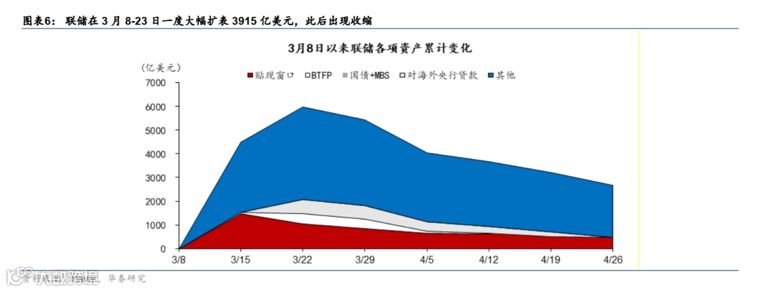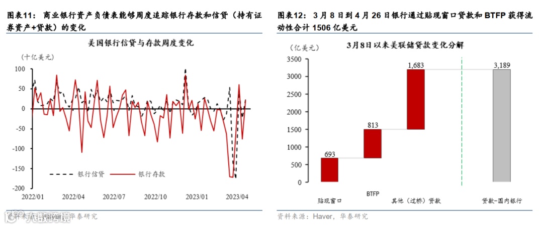 2. 北京时间每周五公布的美联储资产负债表(滞后2天)。主要关注美联储资产和负债中主要分项的变化,(参见华泰宏观系列报告《周度G3央行资产负债表追踪》)。3月8日到4月26日,美联储累计扩表2205亿美元,其中银行通过贴现窗口贷款和BTFP获得流动性合计1506亿美元(图表12),显示银行体系流动性紧张并未明显缓解。