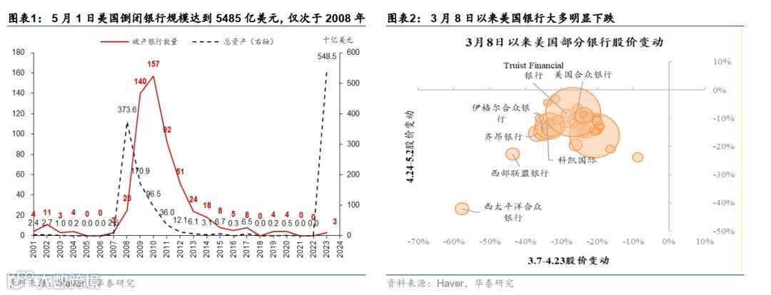 FRC是年内被FDIC接管的第三家银行,总资产规模达到2134亿美元 ,加上此前被接管的硅谷银行和签名银行,截至2023年5月1日美国倒闭的银行规模达到5485亿美元,仅次于2008年(图表1)。5月1日,美国区域银行指数下跌2.8%,规模超过400亿美元的西太平洋合众银行下跌超过10%,其他银行在3月8日以来也大多明显下跌(图表2)。