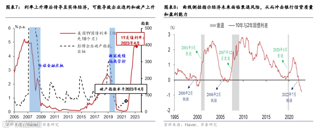 高利率以及曲线倒挂对实体经济和包括银行在内的金融系统的伤害持续存在。首先,高利率带来银行资产减记不仅没有出清,且可能继续累积。3月8日以来,美国10年期实际利率虽然有所回落,但截至5月1日仍然位于1.36%,远高于疫情前的均值(0.5%),因此银行资产端的浮亏并没有明显缓解,而随着商业地产进一步进入下行周期,浮亏还可能进一步扩大。其次,利率上升将滞后传导至实体经济,可能导致企业违约和破产上升(图表7),从而导致银行贷款质量恶化,银行不得不进一步提高拨备,进一步拖累银行盈利。最后,美国国债收益率曲线倒挂幅度仅小幅缓解,曲线倒挂指示经济未来面临衰退风险,从而冲击银行信贷质量和盈利能力(图表8)。