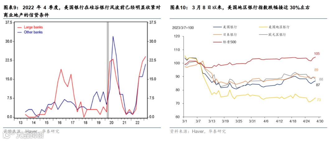 此外,美国银行业风险持续发酵也可能导致银行进一步收紧信贷条件,加速经济衰退的到来。2022年4季度,美国银行在硅谷银行风波前已经明显收紧对商业地产的信贷条件,幅度已经超过2008年金融危机期间,与2020年疫情期间不相上下(图表9)。近期的银行风波导致银行股价明显下跌,截至5月2日,美国银行股价跌幅超过10%,而地区银行指数跌幅超过30%(图表10)。银行股价下跌可能导致银行进一步收紧信贷条件,削减对实体经济的融资,从而导致经济增长影响回落。3月8日到4月19日,美国商业银行持有的债券和对实体经济的贷款下降2161亿美元(相对3月8日下降1.2%),出现了信贷紧缩的初步迹象。4月19日美联储公布的褐皮书也显示,部分地区信贷标准出现收紧。