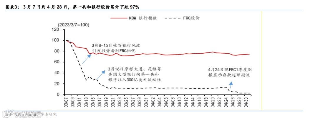 FRC在硅谷银行危机爆发后便遭遇股价下跌和存款流出的困境,一季度财报显示存款流失超预期成为“最后一根稻草”。第一共和银行与硅谷银行同处加州,且资产端存在巨额未实现损失,负债端为不稳定的企业储户,3月8日硅谷银行危机爆发后也遭遇挤兑,且一度传出FDIC已经进入第一共和银行(参见《SVB解决方案:近忧暂缓、远虑犹存》,2023/3/13)。此后随着摩根大通等大行提供300亿美元存款、监管机构推出联合救助措施,第一共和银行危机仅暂时缓解。但由于第一共和银行存款端和负债端所面临的问题都未能得到解决,3月7日到4月24日其股价累计下跌86.2%。4月24日第一共和银行公布的一季度的财报显示存款流失情况超预期,触发股价进一步下跌,并最终被FDIC接管和出售给摩根大通。2023年1季度FRC存款仅有1045亿美元,较2022年四季度大幅下降720亿美元,降幅为41%,而市场预期的存款规模为1450亿-1530亿美元 。如果剔除摩根大通等大行的300亿美元存款,第一共和银行实际存款流失规模达到1020亿美元,降幅达到57.8%。4月24日到4月28日,第一共和银行股价进一步下跌3.4%,相对3月7日累计下跌97%(图表3)。