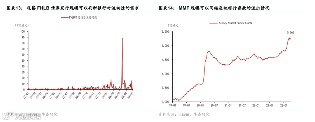 3. 每日更新的FHLB发债数量(实时)。美国联邦住房贷款银行(FHLB)得到美国政府背书,是美国银行体系流动性的重要提供者,银行通常会优先向FHLB而不是美联储寻求融资,因此也被称为“倒数第二位最后贷款人”。观察FHLB债券发行规模可以判断银行对流动性的需求。3月8日硅谷银行危机爆发后,FHLB的发债规模一度大幅上升,凸显了彼时银行体系的流动性需求。上周FHLB发债规模347亿美元,大幅低于3月最多一周(3月13日-20日)的1379亿美元,但高于2021-2022年的平均水平(图表13)。