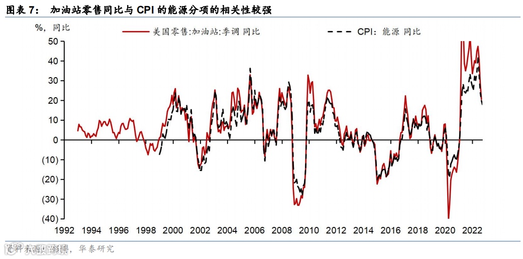 核心通胀外,能源价格,尤其是油价是对总体CPI影响最大的边际变量。历史上看,能源价格是除核心通胀外,对总体CPI影响最大的分项(图表6) 。2018年1月至2022年10月,CPI的能源分项环比于总体CPI与核心CPI的差距项环比的相关性达到96%。另一方面,石油作为重要的工业原材料,其价格的波动也将影响工业产品以及居民生活,进而影响核心通胀及通胀预期。零售数据反应,美国加油站零售总额与CPI的能源分项相关性较高,表示零售端对石油的需求相对“刚性“、替代效应较弱(图表7)。此外,对核心通胀影响较大的机票等交通运输服务的价格也与原油价格有较高的相关性(图表8)。
