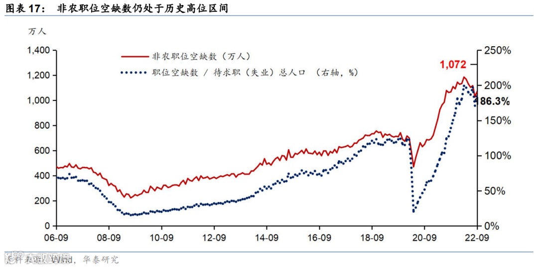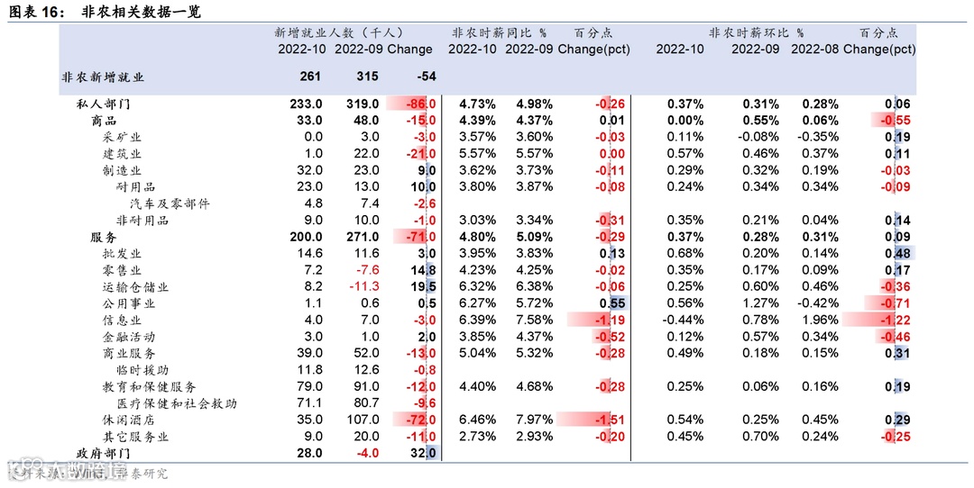 3.劳工供需及薪资通胀水平:如我们在《美国劳工数据隐含怎样的通胀走势》(2022/11/07)中阐述的,劳工市场供需变化、尤其是职位空缺和求职人比例的变化,是核心通胀的重要领先指标、尤其在本轮疫后重启过程中10月非农数据反映就业市场紧张程度的非农职位空缺人数与待业人口之比仍然高企,劳工价格及服务消费通胀走势仍有待观察。