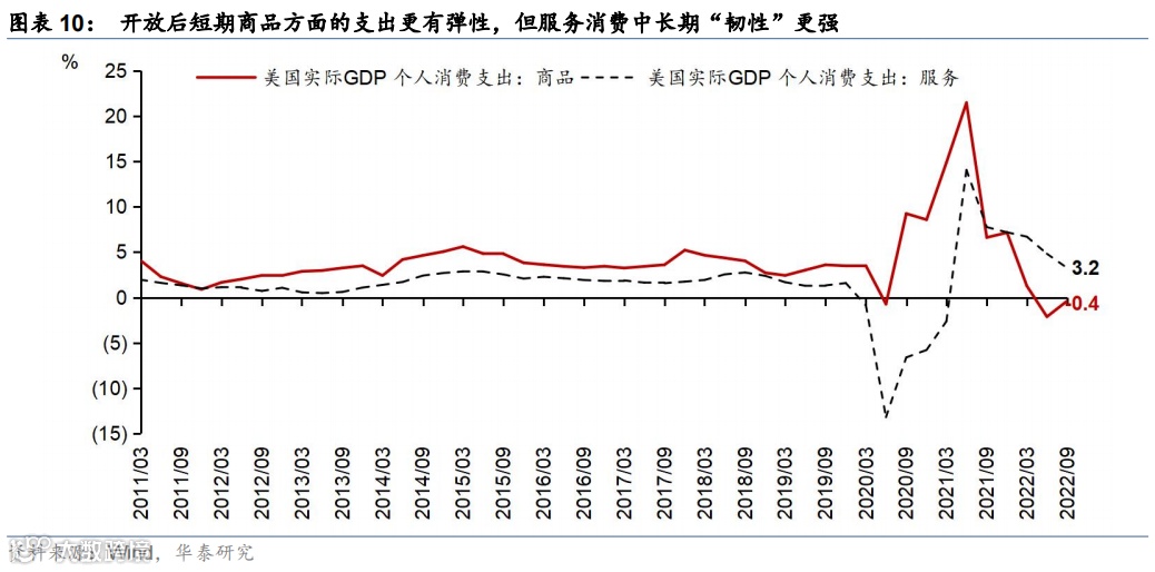 从美国的消费结构看,核心通胀主要由服务业通胀主导,服务消费需求未来可能会为的核心通胀走势带来较大的不确定性。一方面,10月零售数据略超预期,而接下来的感恩节、以及圣诞节带来的“消费旺季”里,相关“体验式“服务需求可能会进一步提升,并将成为检验消费韧性“成色”的重要窗口。美国重启的经验显示,短期内在服务方面的支出“弹性”可能不如商品尤其是耐用品方面的支出“弹性”,但中长期来看,服务消费“韧性”较强(图表10)。具体看,重启相关的服务业(交通运输服务、娱乐、餐饮服务等)作为总体CPI环比的主要贡献项,在美国国内全面放开(2022年3月)以及海外全面放开(2022年6月)的时点对总体CPI的环比有显著贡献,随着圣诞节即将到来,后续美国重启相关的服务业需求可能受提振,从而为通胀水平带来不确定性(图表11)。另一方面,服务业通胀根本的推动因素是劳工工资和租金。目前10月租金环比增速仍高于前值,租金同比增速或未见顶,短期内对核心通胀或存在一定支撑。长期来看,由于租金走势滞后于房价 5 个季度左右、而房价已下行 2 个季度,并已见顶,因此租金同比增速不断上行的趋势或受制约。