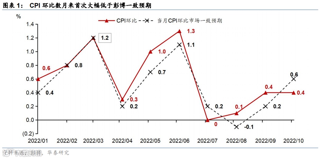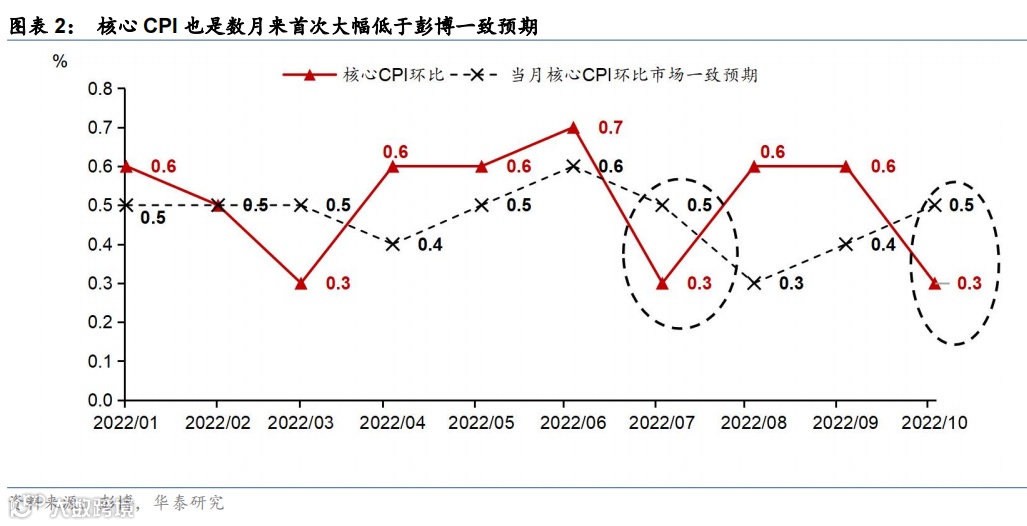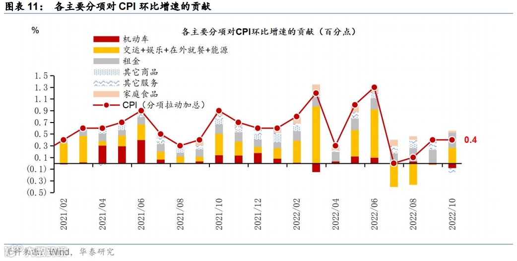 如我们此前分析,10月核心通胀水平低于预期主要是由医疗服务、交通出行以及机动车价格回落导致,其中部分可能由暂时因素导致,持续性仍待观察。1)10月医疗服务项通胀贡献由正转负,但主要是计算方法调整的一次性因素主导:每年10月医疗服务项会调整其计算方式,本轮调整导致10月医疗服务项环比转负,从9月的1.0%下行至-0.6%,同比下降0.9个百分点至5.4%。医疗服务对CPI环比增长的贡相比9月下降0.11个百分点,其对CPI的拖累低于市场预期。2)机票价格回落导致交通出行价格环比回撤、同比涨幅收窄。由于气温下降,10月出行处于相对淡季,且此前机票及其他通胀价格上升抑制需求,10月交通出行项环比为0.8%,低于前值1.9%,其中10月车船公共交通价格环比1.6%,下降0.4个百分点,10月机票CPI环比增速从9月+0.8%的大幅转负至-1.1%,拖累CPI环比0.01个百分点。3)机动车价格尤其是二手车价格环比下降幅度较大。10月机动车环比下降0.9%,较9月-0.2%的跌幅加深。其中10月二手车CPI环比跌幅从9月的-1.1%加深至-2.4%,新车价格环比上涨0.4%,低于9月的0.7%。(参见《美国核心通胀数月来首次低于预期》,2022/11/11)。