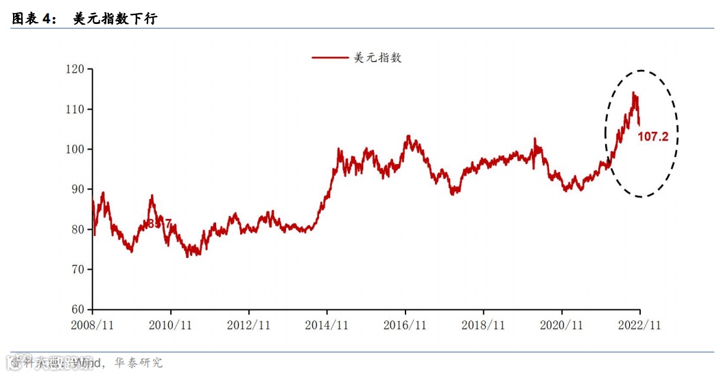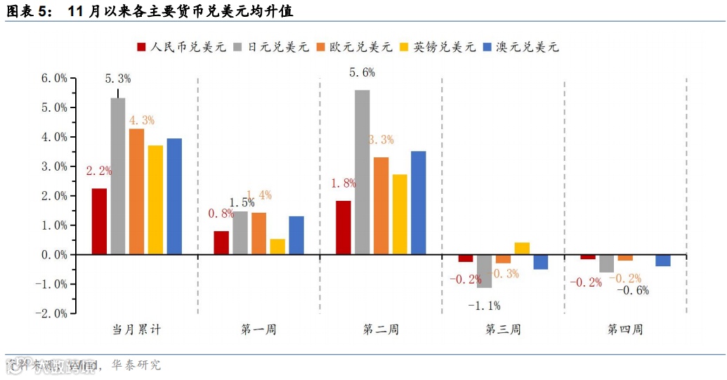 低于预期的通胀数据发布后,美债利率下行、美元走弱,市场偏好有所修复。汇率方面,美元指数出现回调,11月22日美元指数录得107.7,低于10月美元指数均值112,美元指数1个月以来累计下跌5.5%(图表4)。其他主要货币兑美元也相对升值,11月以来日元、欧元、英镑、人民币兑美元分别升值5.3%、4.3%、3.7%和2.2%(图表5)。美债的短端和长端利率亦大幅下行。美国2年期国债收益率从CPI数据发布前(11月9日)的4.61%下降14个bp至4.47%,10年期国债收益率从4.12%下降36个bp至3.76%。股市等风险资产有所反弹,纳斯达克指数和标普500指数11月9日至今分别上涨7.9%和6.8%。市场风险偏好的修复反映了市场对未来通胀可能延续10月通胀下行趋势的期待,而后续通胀是否如市场期待那样持续下行仍有一些重要观察点。