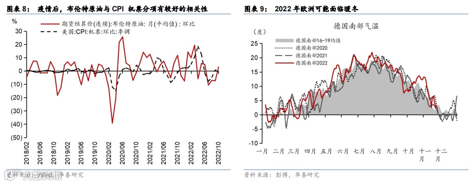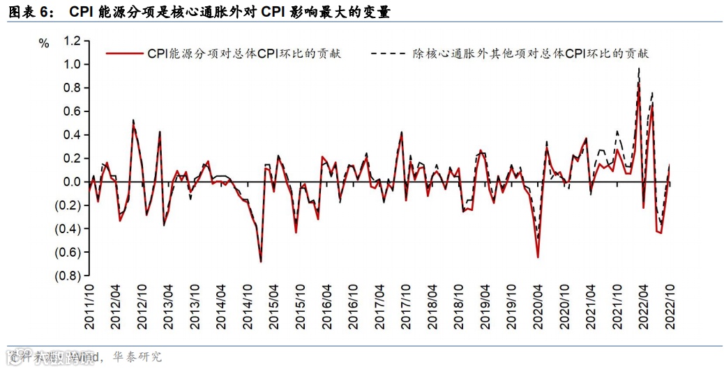 CPI影响最大的边际变量。此外,油价如果持续走高(如2021年至今),也会波及工业生产以及居民生活成本,推动核心通胀及通胀预期上行。近期油价明显回落,但往前看,油价“上限”及俄油禁运对供给侧的可能影响值得关注。此外,欧美气温变化,中国需求走势,俄乌局势、及OPEC决策等,都可能为今冬明春油价走势带来新的不确定性(参见《解析俄油价格“上限”及其潜在影响》,2022/11/25)。