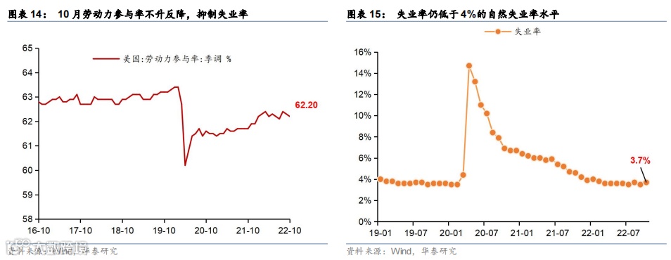 劳工市场动向是目前和核心通胀走势最大的边际不确定因素,而10月非农数据显示劳工市场供需仍偏紧,未来低失业率+高薪资增长组合能否持续有待观察(参见《美国劳工数据隐含怎样的通胀走势》,2022/11/07)。美国 10 月份劳动参与率回落至 62.2%(前值 62.3%),低于彭博一致预期 0.1 个百分点(图表14),主要系 35-44 岁年龄段的劳动参与率下降,而 16-34 岁年龄段的人口中劳动参与率有所上升。失业率 3.7%,较前值上升 0.2pct,但远低于4%的“完全 就业”状态下的自然失业率水平(图表15)。