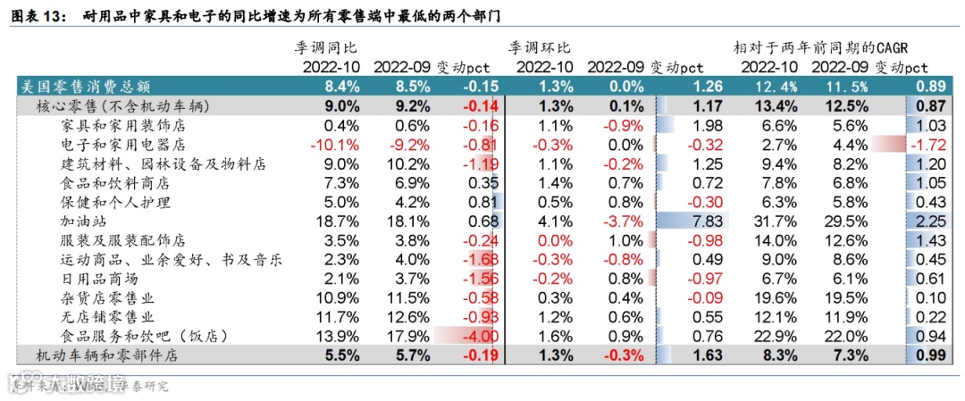 耐用品消费方面,随着商品消费支出的整体下滑,二手车短期内可能受一定制约,电子和家具也可能走弱,但圣诞节等消费旺季短期内是否会提振值得观察。领先指标Manheim二手车价格指数对CPI分项中二手车有较好的预测力度,一般领先CPI二手车价格两个月。目前Manheim二手车价格指数持续下行,预计未来CPI中二手车分项会持续拖累总体CPI(图表12)。零售数据显示,10月家具、电子和家用电器零售端消费同比分别为0.4%和-10.1%,为零售端消费同比最低的两个部门,且电子和家用电器的环比增长已转负,未来可能继续承压(图表13)。