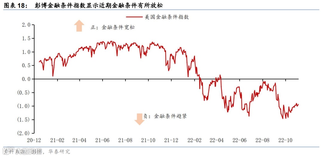 CPI数据发布后,多位联储官员强调抗通胀仍为首要目标、转鸽为时过早。因美国CPI数据低于彭博一致预期,市场对联储的紧缩预期有所回落,利率、汇率及股市层面均有较大反映,导致美国金融条件指数(FCI)出现放松(图表18)。FCI作为联储的核心观察指标,其放松将会导致联储今年“快加息”导致的紧缩压力被进一步削弱。为巩固市场的加息预期,多位联储官员密集讲话,强调抗通胀仍为首要政策目标,立场转鸽为时尚早。11月16日,纽约联储主席威廉姆斯表示,价格稳定对美国经济正常运行至关重要,美联储应该继续专注于其经济目标,避免将金融稳定风险纳入其考虑范围。圣路易斯联储主席布拉德在 11月17日强调,通胀还处在无法接受的高位,而基准利率还未达到5%-7%的足够限制性的区间。波士顿联储主席在11月18日重申,需要更多加息来抑制通胀,12月加息75个基点的可能性依然存在。