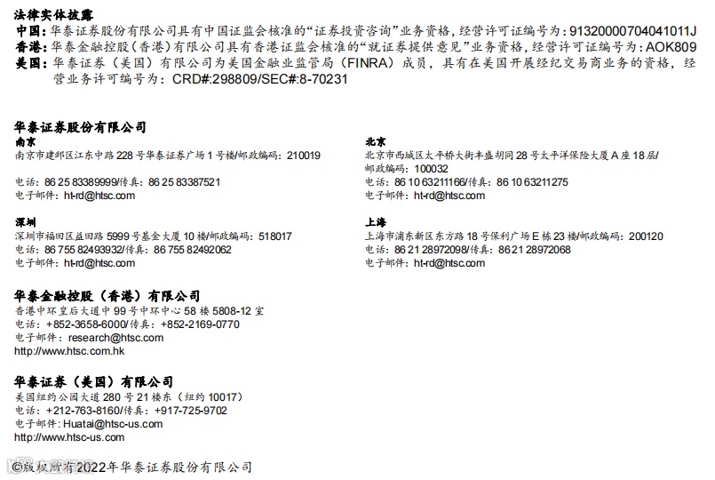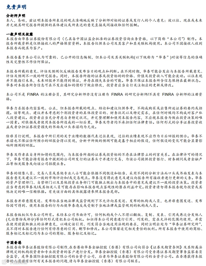 在任何情况下,本公众号中的信息或所表述的意见均不构成对任何人的投资建议。订阅者不应单独依靠本订阅号中的内容而取代自身独立的判断,应自主做出投资决策并自行承担投资风险。订阅者若使用本资料,有可能会因缺乏解读服务而对内容产生理解上的歧义,进而造成投资损失。对依据或者使用本公众号内容所造成的一切后果,华泰证券及作者均不承担任何法律责任。