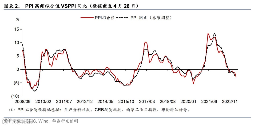 2) 高频指标显示4月PPI可能同比小幅回落至-3%左右,分项中油价环比上升5.9%、CRB现货指数环比上升0.5%,但南华工业品价格环比下降1.7%,中国生产资料价格指数环比下降1.6%,显示工业品价格可能仍在筑底阶段。