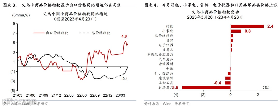 义乌中国小商品周度出口价格指数同比仍在高位,较上周同比上升4.8%,环比回升0.3%。同时,义乌小商品总价格指数同比降幅收窄至0.1%,环比上升0.2%,其中箱包、小家电价格环比回升较大、而厨房用品、五金以及建筑装饰等商品有较大降幅。此外,截止4月21日,周度集装箱运价指数显示4月以来综合运价指数环比上行12.3%、或显示航运需求继续回暖。