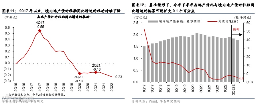 2)渠道2和3:(狭义和广义的)地产信托和地产信用债发行拖累社融同比增长0.1-0.2个百分点。