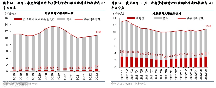 今年上半年地方专项债明显前置发行,提振社融同比增速0.7个百分点。随着今年地方专项债额度基本在6月底之前发行完毕,仅今年2季度新增地方专项债发行对社融同比的拉动就达0.7个百分点,明显高于去年同期的0.4个百分点(图表13)。由此,截至今年6月末,政府债净发行比去年同期扩张达2.2万亿元,政府债净融资对社融同比增速的拉动达3.1个百分点,较去年底提升0.6个百分点(图表14)。