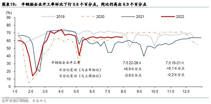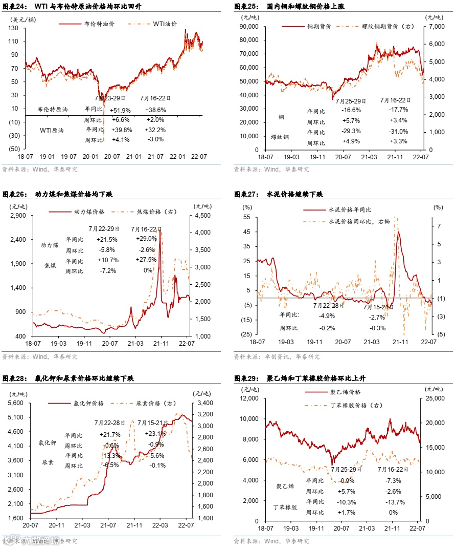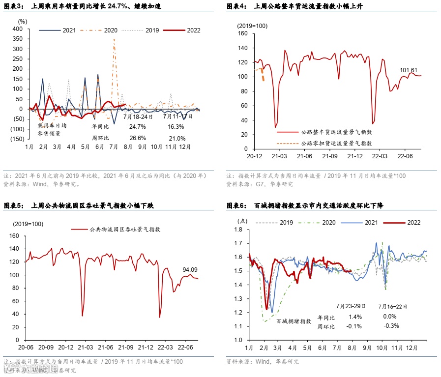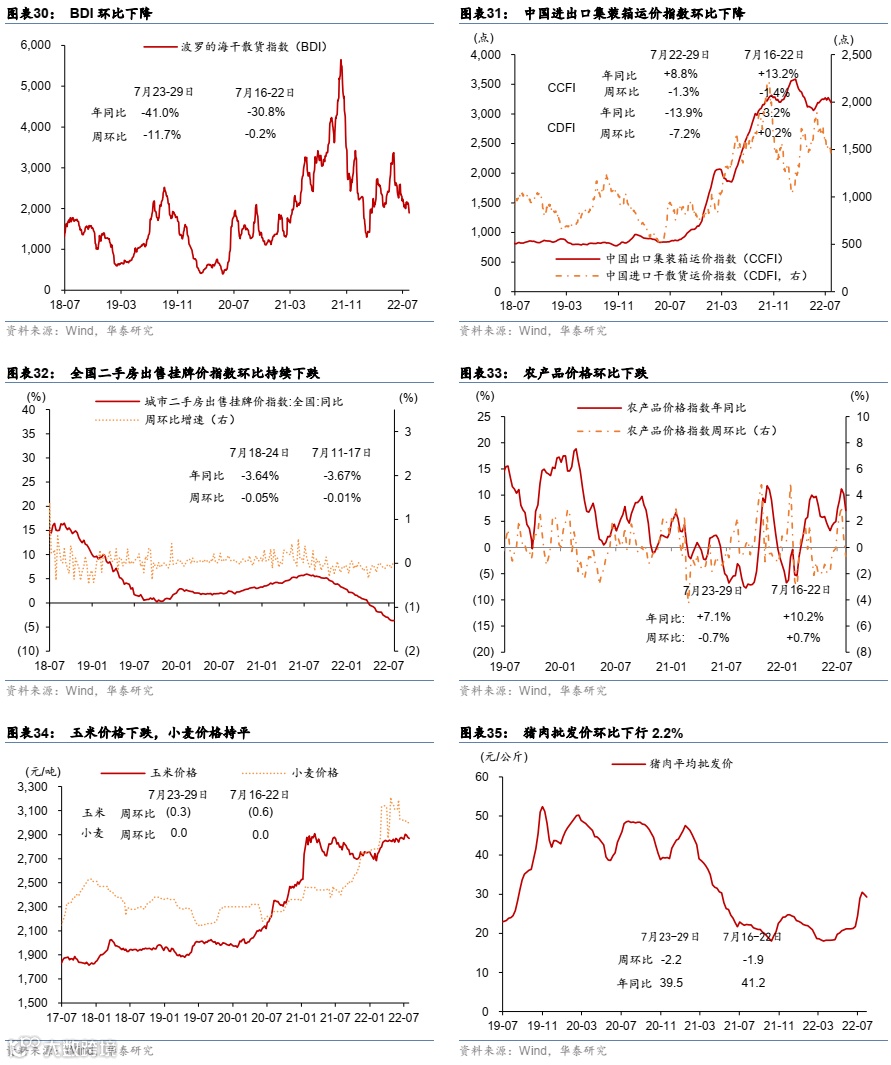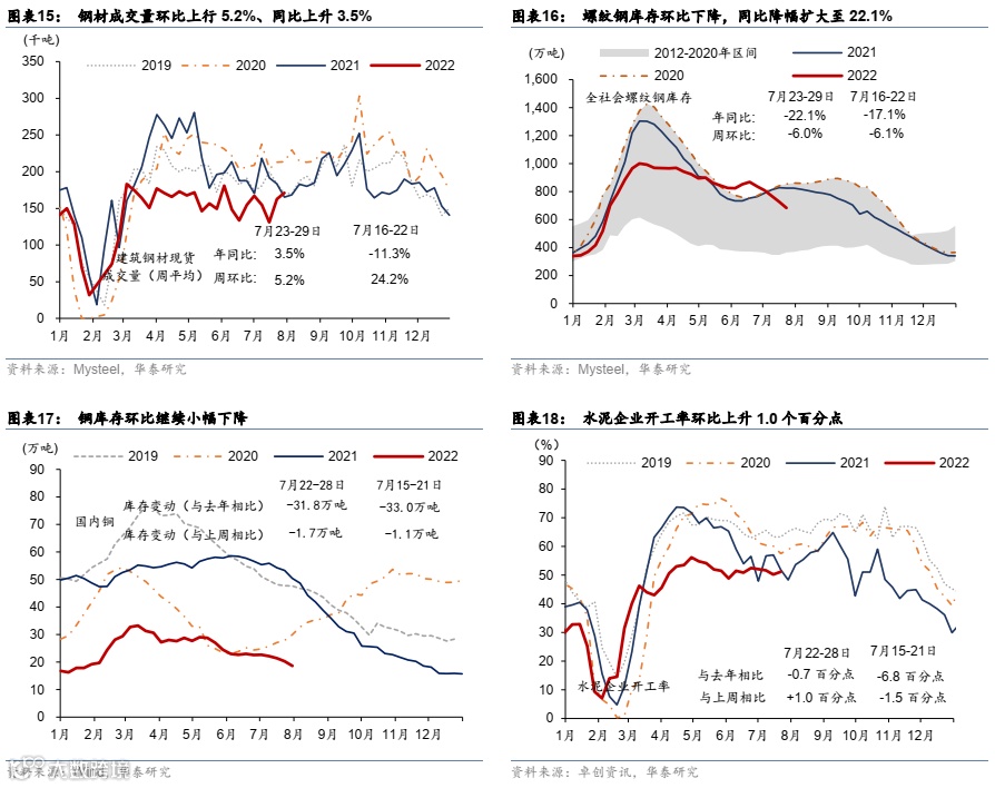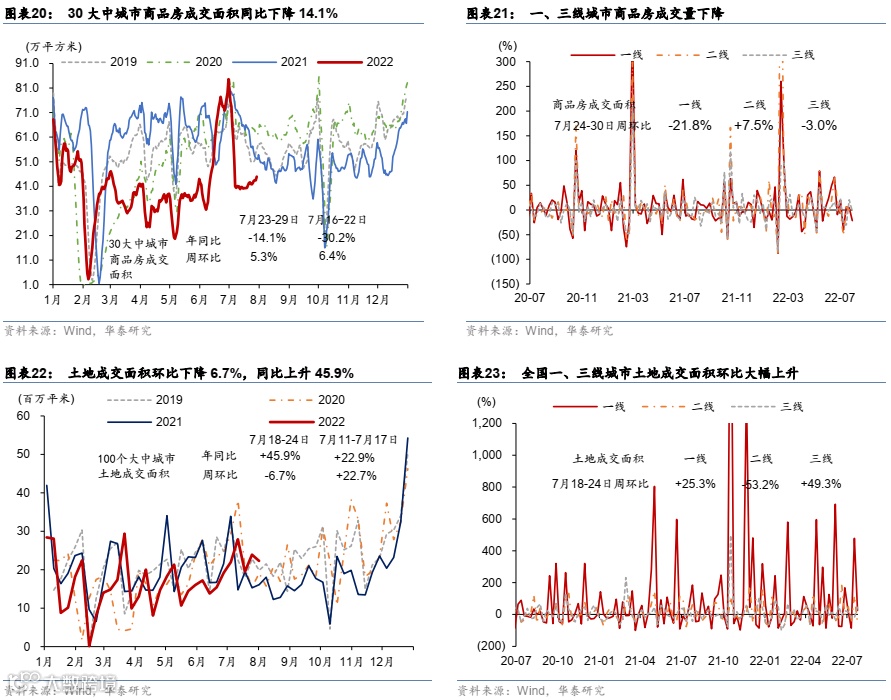 上游重工业生产减速,但汽车生产和销售保持较快增长。上周一二线城市房地产和土地成交明显回升。7月23日-29日,全国新增本土感染者875例,广西、甘肃、四川等地疫情情况均较为严峻;截至7月30日,全国共有中/高风险地区646/452个。上周18城地铁客运量同比跌幅缩减至5.5%,国内航班数略有回落,但汽车销售持续改善,7月18-24日全国乘用车零售量同比增速进一步加快至24.7%;同时半钢胎企业开工率维持高位在64%。此外,上周物流园区吞吐指数环比小幅上行0.6%,整车物流指数环比下行1%。工业生产方面,上周焦化企业开工率下降3.7个百分点,高炉开工率下行1.6个百分点,终端需求走弱压制焦钢企业利润。另一方面,基建落地进度可能有所加快,水泥开工率环比走高1个百分点,且钢材成交量环比上行5.2%。地产方面,上周30城商品房成交面积同比跌幅收窄至14.1%,同时土地成交同比大幅上行45.9%,主要是由于上海、东莞等地释放出一批集中供地。