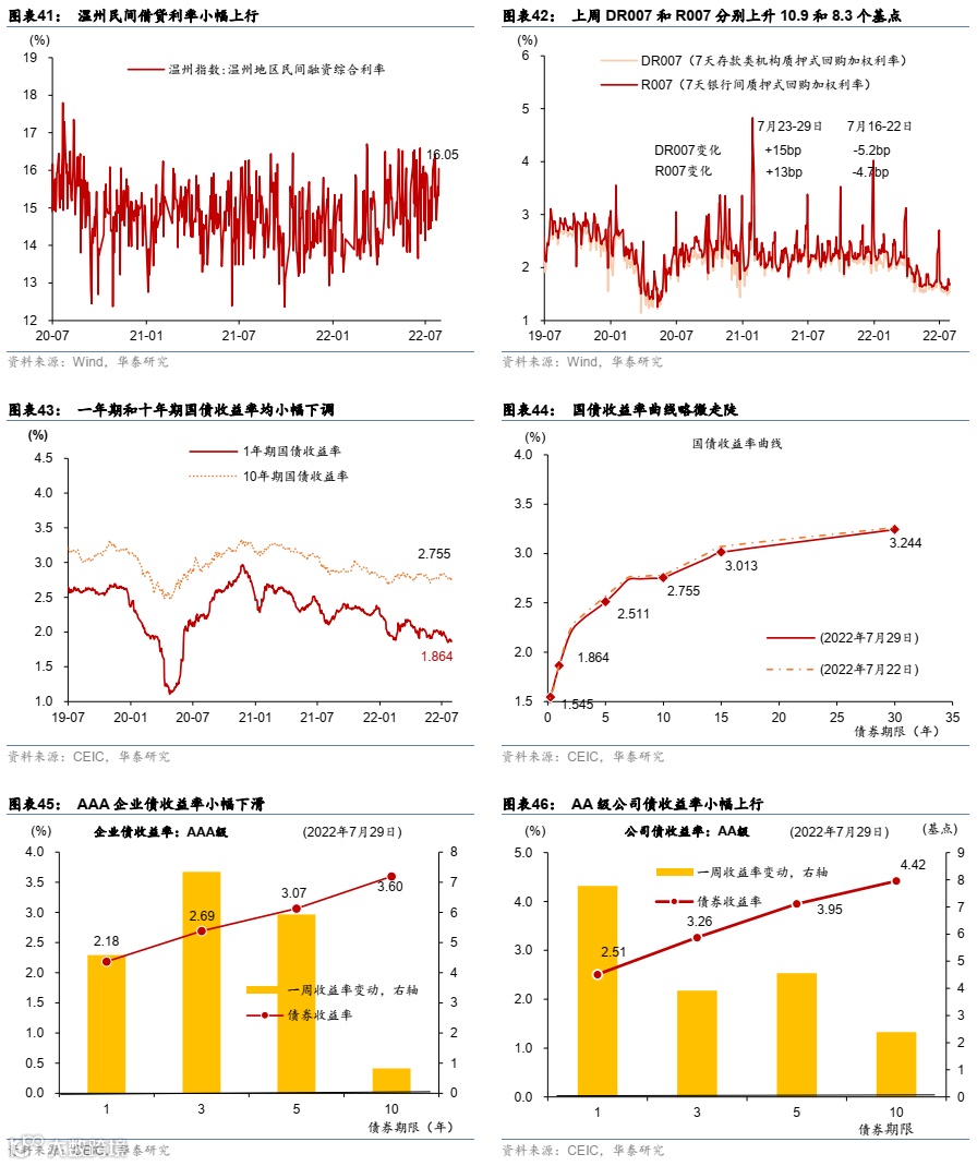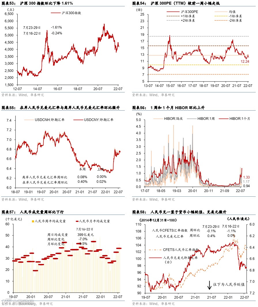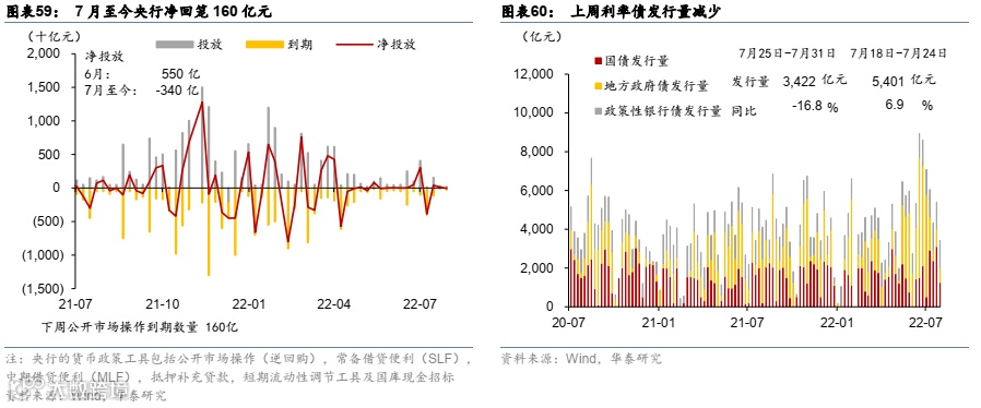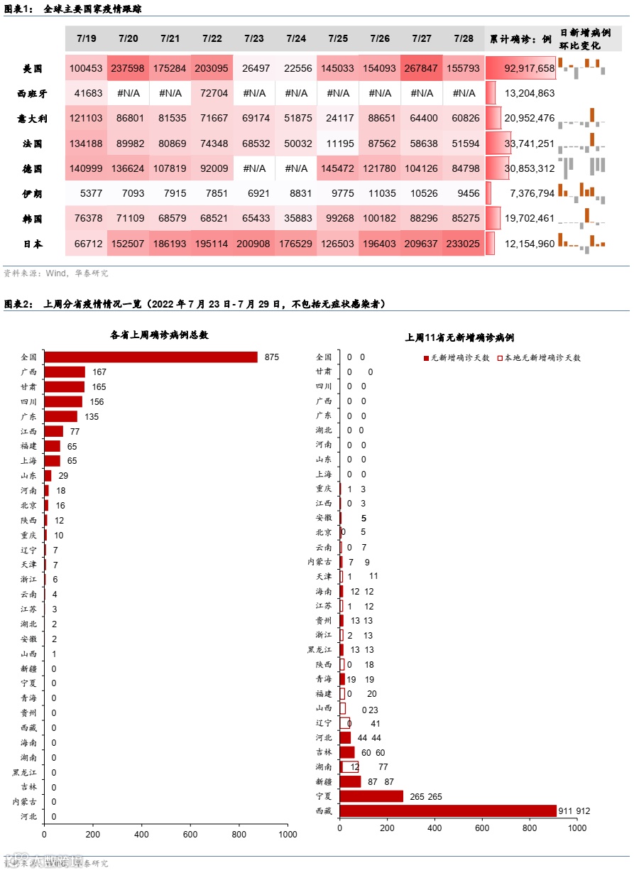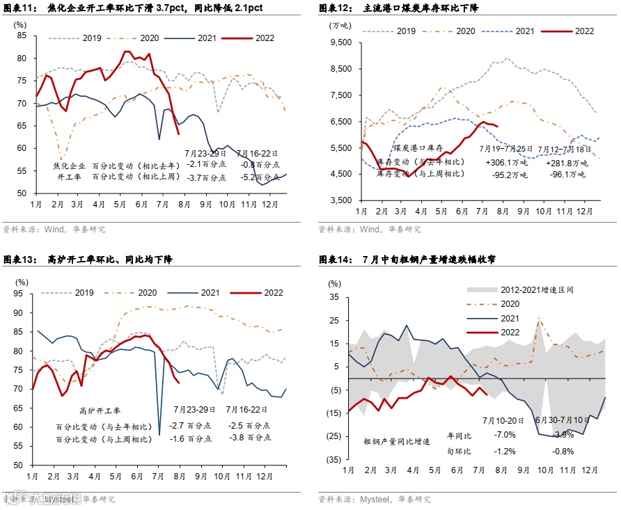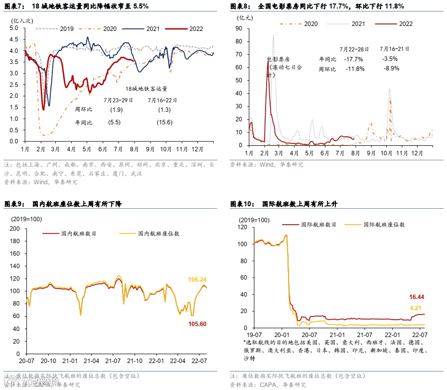 上游重工业生产减速,但汽车生产和销售保持较快增长。上周一二线城市房地产和土地成交明显回升。7月23日-29日,全国新增本土感染者875例,广西、甘肃、四川等地疫情情况均较为严峻;截至7月30日,全国共有中/高风险地区646/452个。上周18城地铁客运量同比跌幅缩减至5.5%,国内航班数略有回落,但汽车销售持续改善,7月18-24日全国乘用车零售量同比增速进一步加快至24.7%;同时半钢胎企业开工率维持高位在64%。此外,上周物流园区吞吐指数环比小幅上行0.6%,整车物流指数环比下行1%。工业生产方面,上周焦化企业开工率下降3.7个百分点,高炉开工率下行1.6个百分点,终端需求走弱压制焦钢企业利润。另一方面,基建落地进度可能有所加快,水泥开工率环比走高1个百分点,且钢材成交量环比上行5.2%。地产方面,上周30城商品房成交面积同比跌幅收窄至14.1%,同时土地成交同比大幅上行45.9%,主要是由于上海、东莞等地释放出一批集中供地。