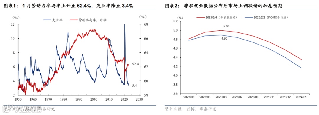 美国1月新增非农就业+51.7万人,大幅超过彭博一致预期的+18.5万人。劳动参与率回升0.1个百分点至62.4%,失业率下降0.1个百分点至3.4%,为近50年的低点,小时工资环比下降0.1个百分点至0.3%。大幅超预期的非农就业显示美国劳动力市场仍有较强韧性,经济硬着陆风险下降,同时也指示通胀粘性或超预期。