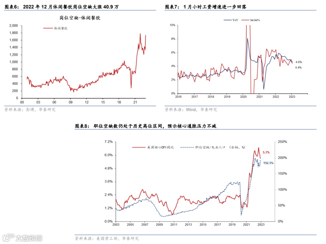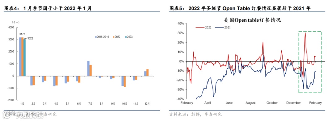 非农数据超预期不是因为技术性因素,而是反映美国服务业的较强复苏。剔除罢工影响,1月美国非农数据仍然高达45.9万;行业分类调整(NAICS 2022)只会影响新增非农就业在不同行业的分布,不影响新增非农就业的总量;1月季节因子低于2022年1月及历史平均,不是非农超预期的原因(图表4)。我们认为,1月新增非农就业大超预期的背后是圣诞节假期美国服务业的快速复苏。2022年圣诞节是美国走出疫情后的第一个圣诞节假期,受疫情拖累的休闲餐饮等服务业出现明显复苏。从新增非农就业的行业分布来看,休闲餐饮、教育医疗贡献最大,合计达到23.3万(图表3);从Open table餐饮上座率来看,2022年圣诞节期间要明显高于2021年圣诞节期间(图表5);从岗位空缺来看,2022年12月休闲餐饮行业岗位空缺大幅上升40.9万,接近历史最高水平,背后可能是企业为应对假期需求上升而大规模招聘(图表6)。此外,1月ISM非制造业PMI跳升至55.2,显著超过预期的50.4,也证实美国服务业出现较强复苏。