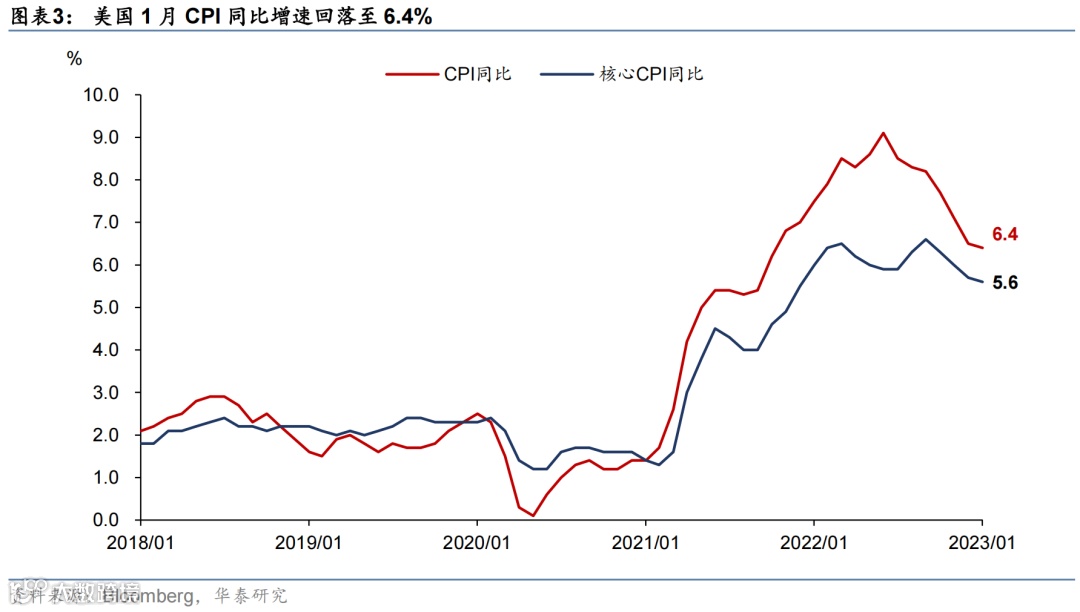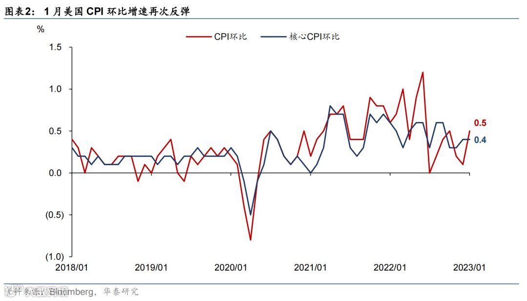 美国1月通胀数据略超预期——CPI环比回升0.5%,与彭博预期一致(12月+0.1%),同比增速从12月的6.5%回落至+6.4%,略高于一致预期的6.2%。CPI环比增速再度回升主要是因为能源和核心商品价格上行以及权重调整。核心CPI环比增速持平于0.4%,与彭博预期一致,同比增速从5.7%回落至5.6%,略高于预期的5.5%。CPI数据公布后,美债长短端均小幅上行,美元指数微跌,加息预期回升——2年期和10年期美债收益率分别上行9bp和5bp至4.60%和3.75%,美元指数103.3下跌至103.1,市场预期的美联储加息终点上升8bp至5.27%。