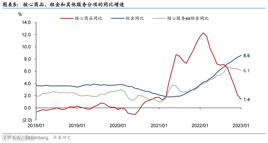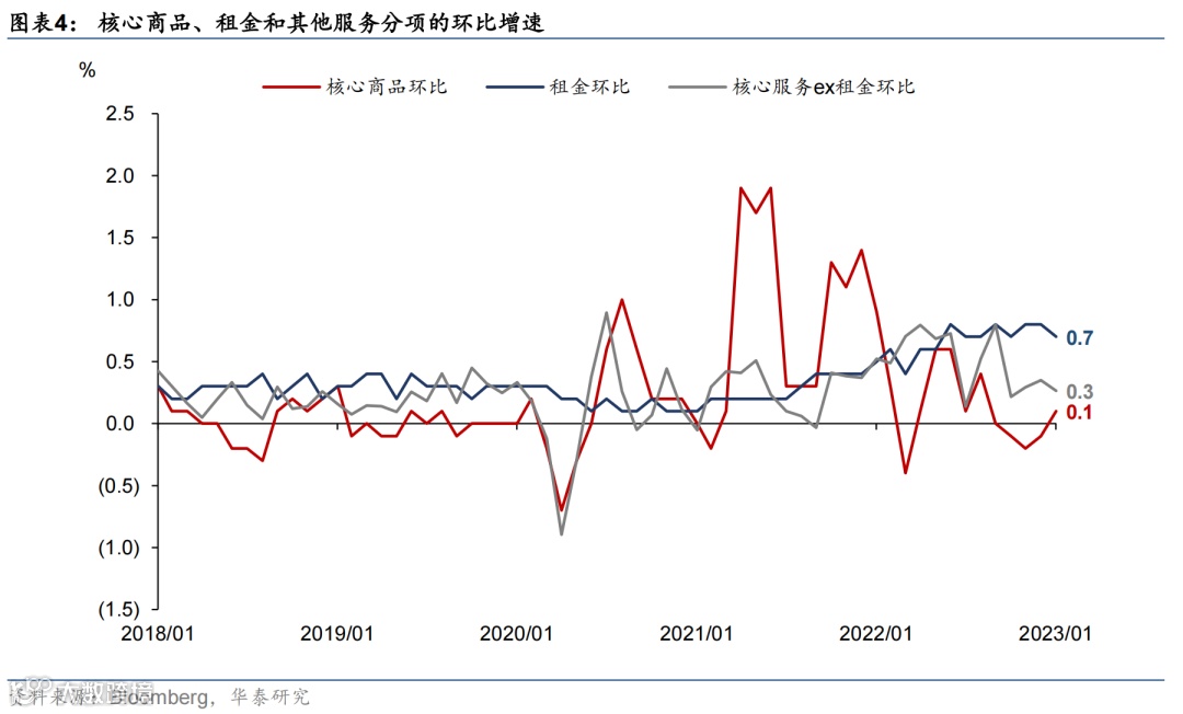 核心服务分项环比上涨0.5%,略低于12月的0.6%。其中,租金分项环比上涨0.7%,相对前值(0.8%)小幅回落;鲍威尔此前多次提及的剔除租金的核心服务分项环比上涨0.26%,相对前值(0.35%)有小幅回落。往前看,由于美国房价同比增速已见顶,且租金的高频指标也出现回落,我们预计CPI房租分项或于今年2季度见顶(参见《解析海外地产下行周期的宏观影响》,2023/01/12),而剔除租金的核心服务分项取决于工资增速前景。