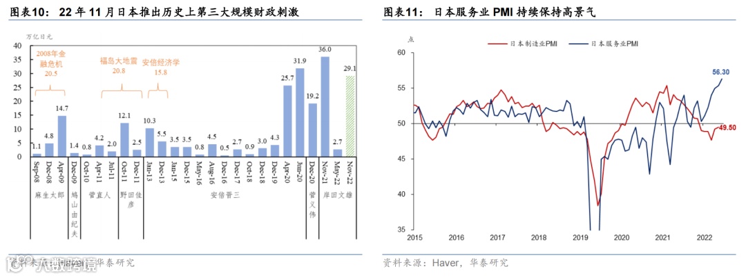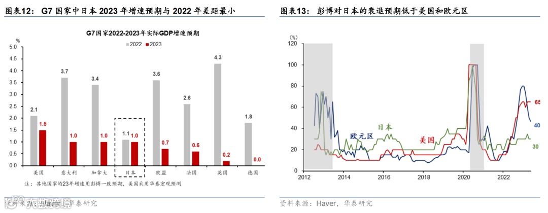 ● 疫后经济修复、财政刺激提振经济基本面。2022年2季度退出常态化防疫以来,日本经济持续修复,特别是服务业保持高景气(图表8、11)。服务业PMI自22年11月以来处于扩张区间并持续上行,放宽入境限制后,日本入境游客数量迅速恢复,截至3月恢复至疫情前的73%,仍有进一步修复的空间(图表9)。2022年11月4日,日本政府公布2022财年的第二份补充预算,为历史上第三大规模,净新增支出占21年GDP的5.4%(图表10),对GDP增长的提振约为 1 个百分点左右(参见《再论日本央行退YCC的概率及影响》,2022/12/26)。此外,2023年日本经济增速彭博一致预期相对2022年并未明显回落,而其他发达经济体普遍明显回落(图表12)。最后,美国和欧元区未来12个月的衰退风险均明显高于日本,提振了日本股市的相对吸引力(图表13)。