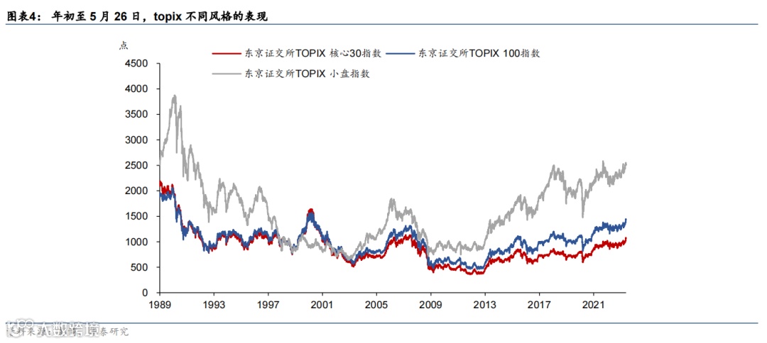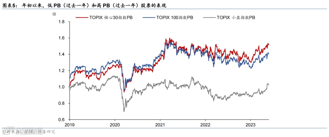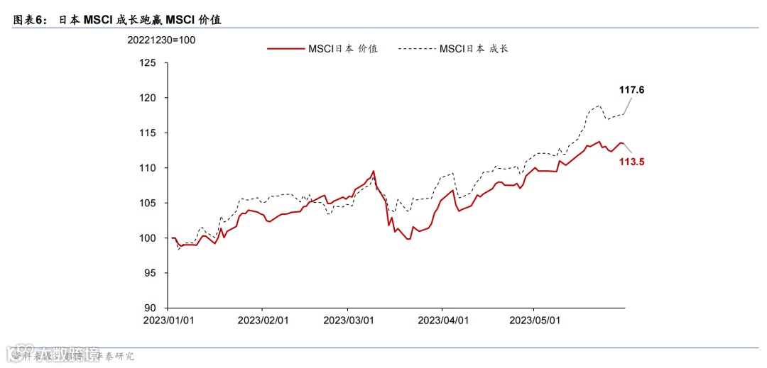 从风格来看,大盘股上涨超过小盘股,MSCI成长跑赢MSCI价值。TOPIX核心30指数累计涨幅为17%,而TOPIX 100指数和TOPIX 小盘指数涨幅分别为16%和10%。考虑到2022年以来,TOPIX核心30指数的P/B高于TOPIX 100指数和TOPIX小盘指数,因此本轮日本股市的上涨可能由基本面相对较好,盈利水平相对较强的龙头企业推动。此外,MSCI成长股年初以来累计涨幅是18%,而MSCI价值仅为24%(图表6)。
