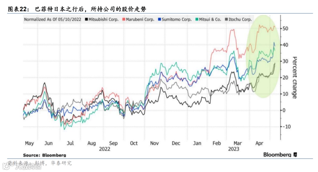 ● “巴菲特效应”进一步助推日股上涨。巴菲特2020年起开始投资日本的“五大商社”(伊藤忠商事、丸红、三菱商事、三井物产和住友商事),并在2022年进一步增持。2023年4月11日巴菲特到访日本,并在采访中表示将讨论进一步投资日本股市,此后 “五大商社”股价持续走高(图表22)。巴菲特的到访还推升了市场对于日本股市的乐观情绪,Citadel、Point72等对冲基金也相继造访日本,自4月11日起至5月29日,日本TOPIX指数累计上涨8.9%(图表21)。