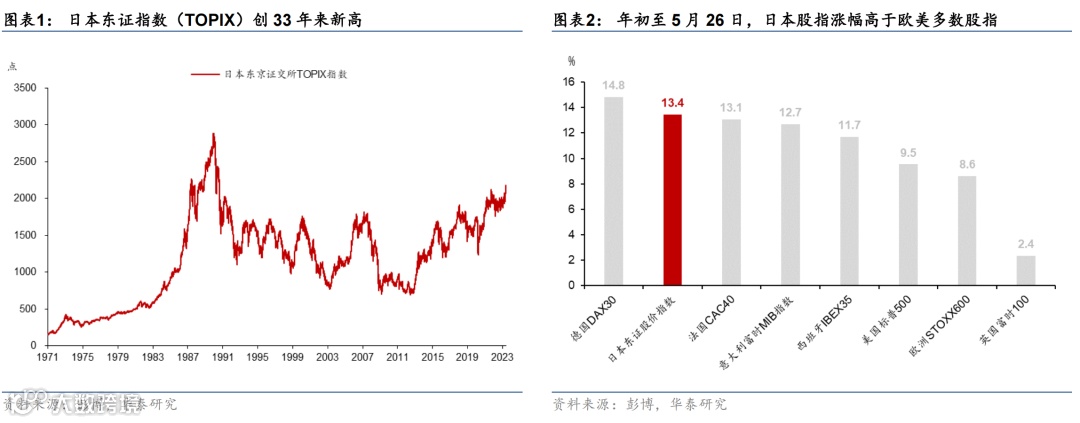 2023年以来日本股市表现亮眼,东证指数(TOPIX)累计上涨13.4%至2168点,创下近33年的高点,表现好于美国和欧元区。由于近期东京证交所发布了推动企业通过经营改革提高盈利水平和估值的指引,日本股市的上涨又称为“日特估”。本文从盈利、估值、头寸和催化剂四个角度具体分析“日特估”行情的原因以及可持续性。