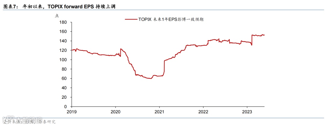 从盈利端来看,经济基本面改善、摆脱通缩以及汇率贬值等因素共同提振企业盈利。年初以来,TOPIX forward EPS持续上调(图表7)