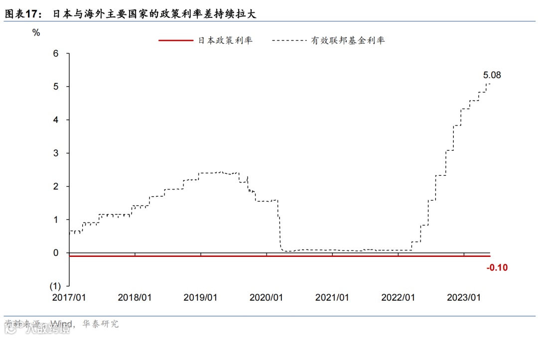 ● 年初以来,日元整体贬值推升企业盈利。日央行新行长植田和男在4月会议上称,“当前阶段”将继承黑田的大规模宽松政策YCC政策,这被市场解读为日央行暂时不会退出YCC政策,导致日元相对美元贬值。截至2023年5月26日,日元兑美元累计贬值超过6%。由于日本企业海外收入占比较高,汇率贬值推升日本企业盈利(图表16)。