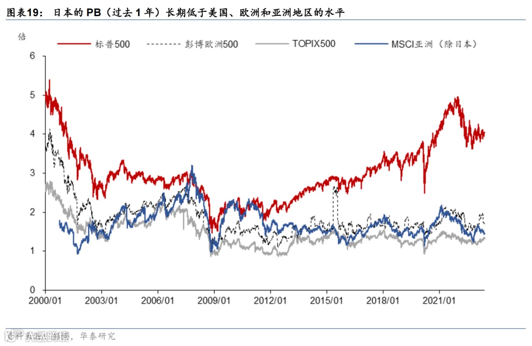 ● 当前日本股市估值仍处于中性水平。截至5月29日,TOPIX500股指的P/E为16.7倍,与2013年以来的P/E均值(16.4倍)基本相当,低于2020年以来的均值(17.5倍)。且本轮日本估值的提升斜率相对平缓,未出现明显的泡沫化倾向。与其他国家股市的P/B(过去1年)相比,日本的P/B水平长期低于美国、欧洲以及亚洲其他地区(图表19)。