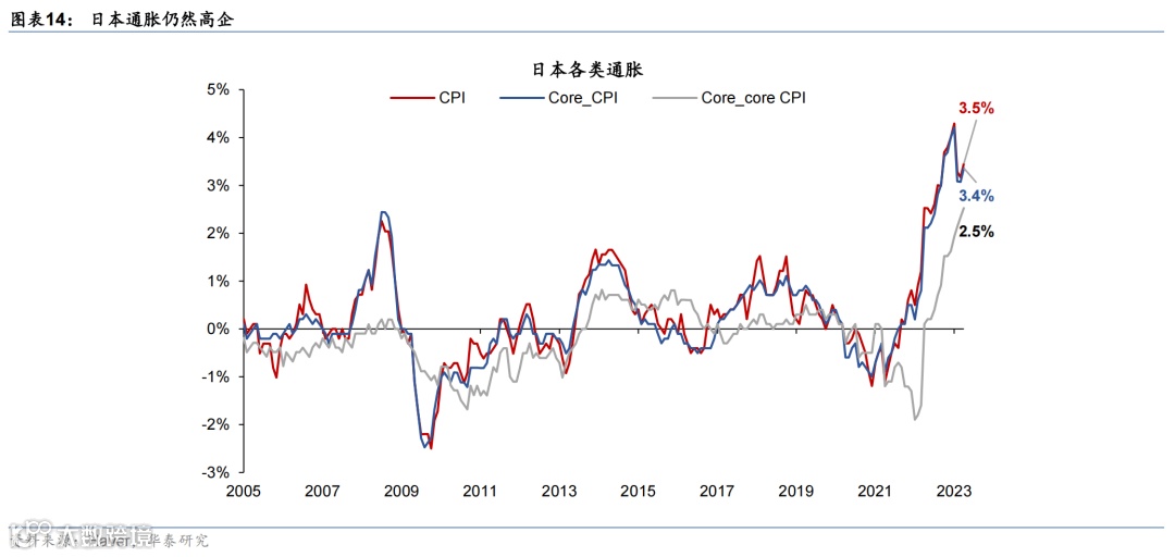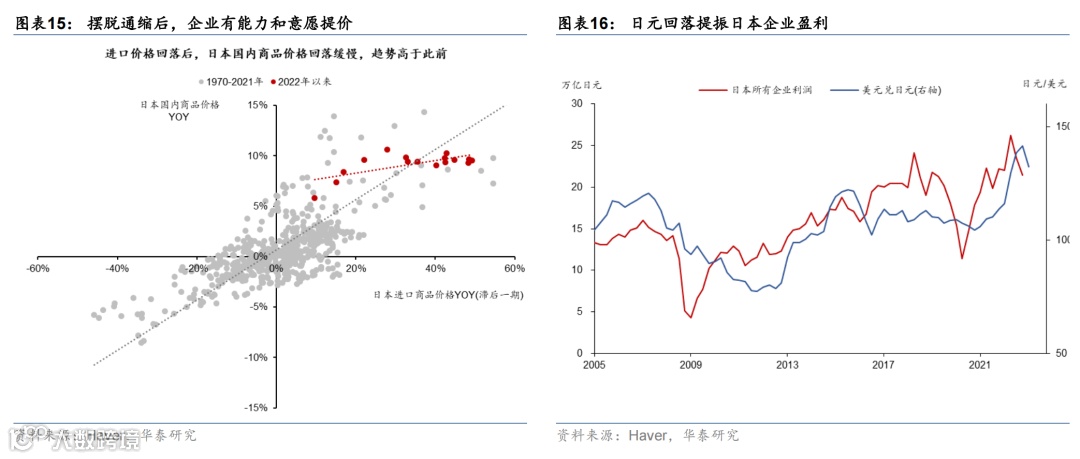 ● 日本摆脱通缩,企业提价意愿上升提振企业盈利。2022年以来,日本通胀快速回升,总体CPI一度达到4.4%,创近40年以来新高,近期由于政府的能源补贴措施,回落至4月的3.5%(图表14)。通胀大幅上升推升企业和居民中长期的通胀预期,叠加日本失业率位于低位,工资增速持续回升,打开了企业的提价空间和意愿。例如,历史上日本国内产品的价格会略滞后于进口产品价格,且变动幅度相对稳定。但2022年10月以后进口价格见顶回落,但国内产品价格回落幅度小于此前趋势所指示的幅度,反映国内企业的定价权的提升,从而边际上提高盈利(图表15)。