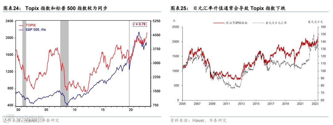 ● 海外衰退或者市场调整或对日本股市产生负面溢出。日本是一个外向型经济体,2022年商品和服务出口占GDP之比为21.6%,远高于美国(11.7%)。日本上市公司海外收入占比也较高,海外经济衰退将冲击日本企业盈利。此外,海外股市下跌也会通过风险情绪等渠道拖累日本股市的表现,日本股市无法“独善其身”。例如2000-2023年4月,Topix指数与标普500指数较为同步,两者相关性达到0.78(图表24)。根据我们的判断,基准情形下,预计美国可能在明年上半年进入“浅衰退”,2024年全年实际GDP增速将从2023年的1.5%降至0.2%,美国经济和股市都面临下行风险,这可能对日本股市的表现产生冲击(参见《美国宏观展望:软着陆与黑天鹅之辩》,2023/5/28)。