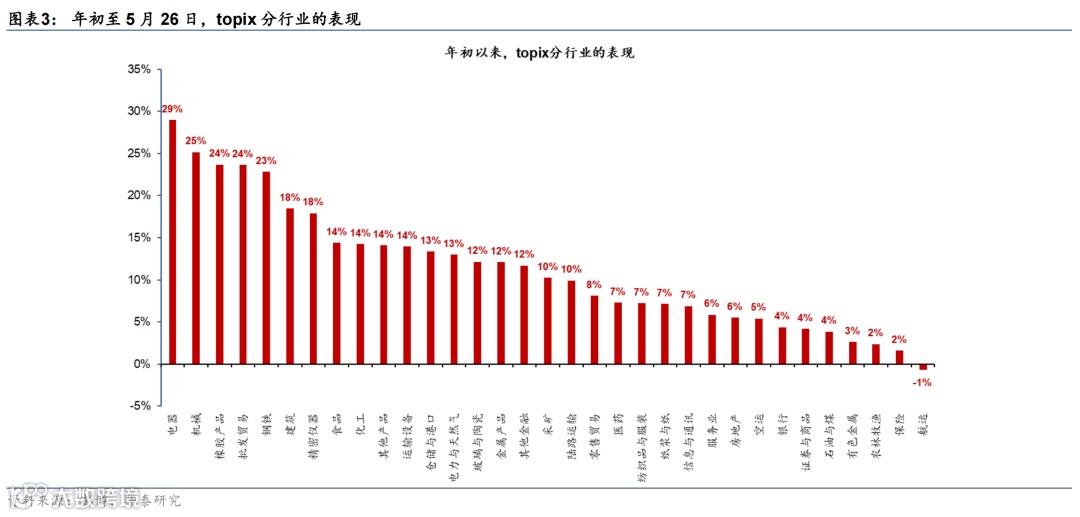 今年以来日本股市持续上涨,创1990年日本股市泡沫破裂后新高。截至5月29日,东证指数(TOPIX)累计上涨13.4%至2168点,为近33年的高点(图表1)。同时,年初起至5月26日,日本股市的总体表现强于法国CAC40(13.1%)、美国标普500(9.5%)以及欧洲STOXX600 (8.6%)等大部分股指(图表2)。分行业来看,TOPIX多数行业明显上涨,其中日本优势行业包括电器(YTD 29%)、机械(YTD 25%)、橡胶产品(YTD 24%)、批发贸易(YTD 24%)等涨幅居前,仅航运(YTD -1%)小幅下跌。