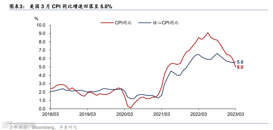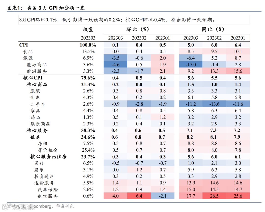 美国3月CPI不及预期,核心CPI与预期一致——CPI环比从0.4%放缓至0.1%,低于彭博一致预期的0.2%,同比增速快速下行,录得5.0%(2月6.0%),低于彭博一致预期的5.1%。核心CPI环比小幅下行至0.4%,同比增速回升0.1pct至5.6%,均与彭博预期一致。CPI同比大幅回落主要来自能源分项的拖累,住房以及其他核心服务分项环比回落,显示需求有所降温。