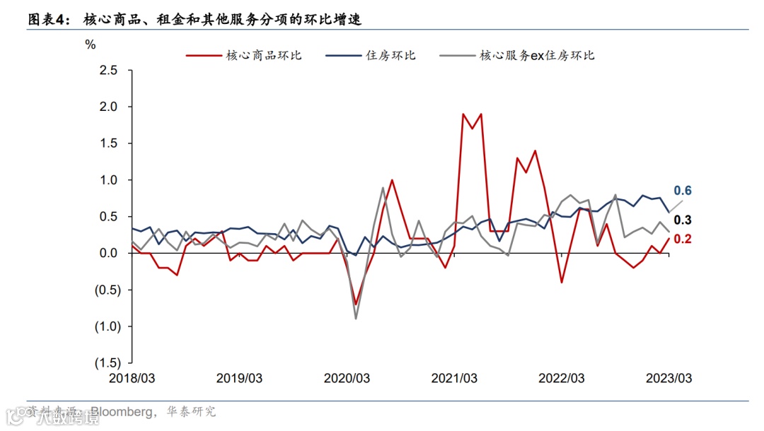 能源、食品等非黏性通胀整体回落,但OPEC减产导致油价上行可能加大未来能源通胀的压力。能源价格回落导致能源分项环比下降2.9pct至-3.5%,叠加2022年3月的高基数,能源分项同比从5.2%大幅下降至-6.4%,是CPI同比增速回落的最大贡献。但近期OPCE超预期减产导致油价上行,油价基数效应消退,未来CPI同比的下降幅度将明显放缓。同时,食品价格环比从0.4%降至0%。