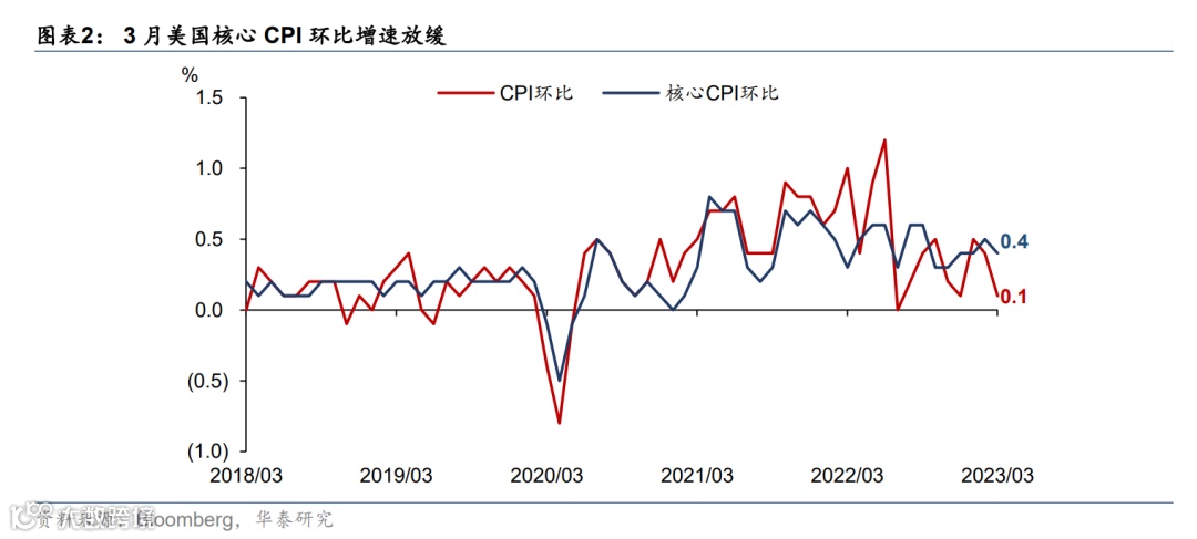美国3月CPI不及预期,核心CPI与预期一致——CPI环比从0.4%放缓至0.1%,低于彭博一致预期的0.2%,同比增速快速下行,录得5.0%(2月6.0%),低于彭博一致预期的5.1%。核心CPI环比小幅下行至0.4%,同比增速回升0.1pct至5.6%,均与彭博预期一致。CPI同比大幅回落主要来自能源分项的拖累,住房以及其他核心服务分项环比回落,显示需求有所降温。CPI数据公布后,截至北京时间晚上9:00,美债长短端收益率均下行,美元指数下跌,加息预期回落——2年期和10年期美债收益率较前一天的收盘价分别下行10bp和6bp至3.92%和3.36%,美元指数下跌0.6%至101.6,美联储5月加息25个基点的概率从数据公布前的72%下降至67%。