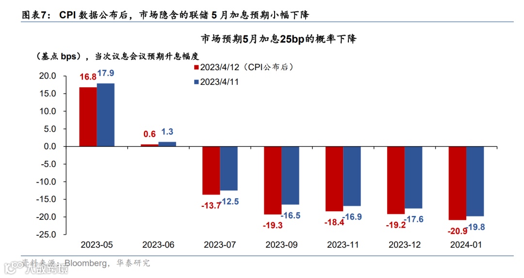 往前看,我们认为通胀回落最快的时候或将过去,偏高的核心通胀意味着联储仍然难以放松,5月仍有一定概率加息25bp。原油价格上涨以及能源基数效应在年中逐步消退,通胀或难以快速回落。通胀当前的回落幅度并不足以让联储有足够的信心开启降息周期。正如我们在《3月FOMC,变鸽派、但或仍不够鸽》(2023/3/23)中所述,劳工市场和通胀不是影响美联储货币政策最核心的变量——高利率下的金融系统/实体经济的脆弱性暴露,可能导致联储在下半年降息。