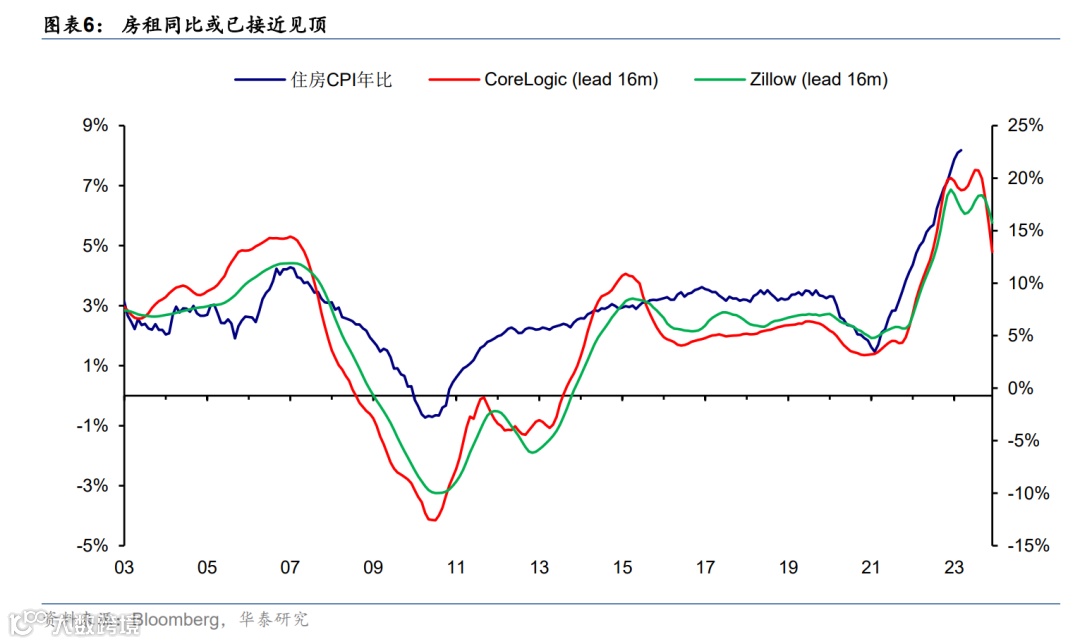 黏性较强的核心服务通胀开始减速,特别是住房分项,可能是因为需求降温。3月核心服务环比从0.6%回落至0.4%。其中,黏性较强的住房分项环比增速从0.8%放缓至0.6%,为过去4个月的最低水平。CPI的统计方式导致住房分项的变化滞后于市场租金和房价,后者指示住房分项可能在年中逐步见顶回落。剔除住房的核心服务通胀也出现减速,环比增速从0.4%放缓至0.3%。其中,娱乐分项环比明显放缓,从2月的+1.2%下降至0%;教育通讯和运输服务分项通胀环比增速小幅上涨。