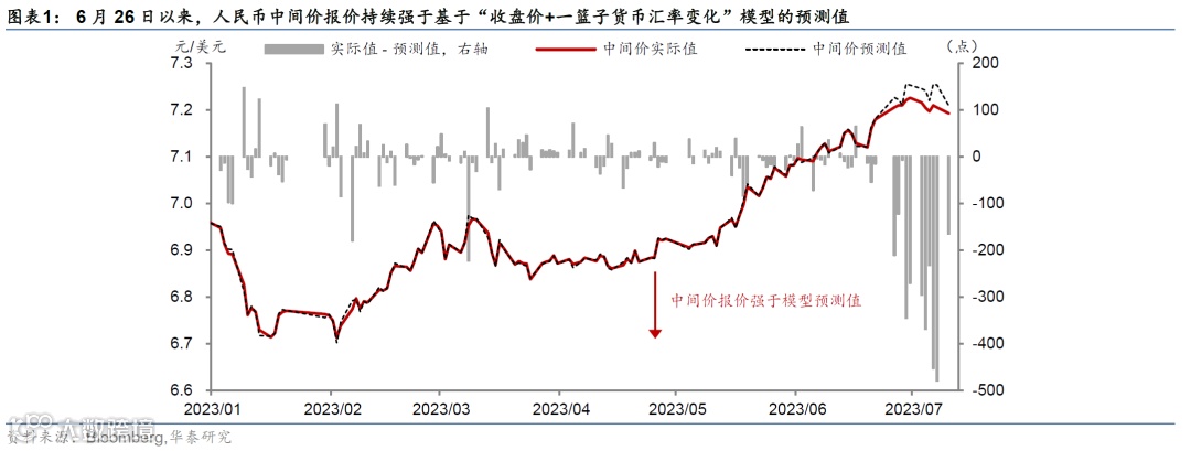 5月后人民币汇率有所波动,近日央行对汇率变化的关注度提升。6月26日以来,我们构建的中间价预测模型显示,央行可能在中间价报价时重启了“逆周期因子”(图表1)。同时,央行6月30日发布的2季度货币政策委员会例会通稿强调稳定汇率预期、防止汇率大幅波动(参见《稳增长关注度上升|点评央行2季度货币政策委员会例会》,2023/7/1)。7月以来,人民币兑美元汇率整体呈震荡走势。