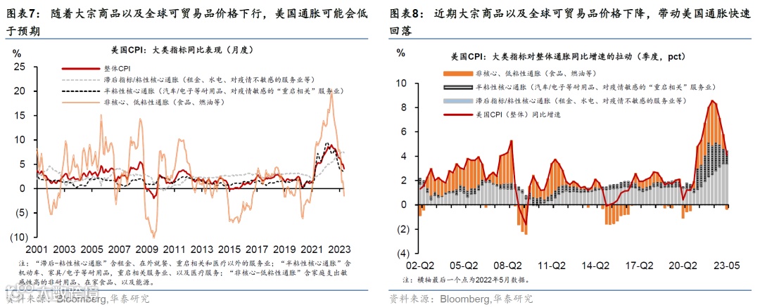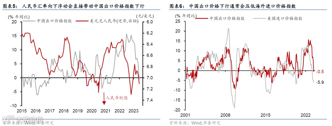 2. 机理1——人民币汇率是影响出口及贸易品通胀的重要因素,包括美国和欧洲。假以时日,美国通胀走势可能会开始低于国内预期,美联储加息预期可能边际下修,降低美元升值压力。与小型经济体不同,根据世界银行数据,2022年中国贡献全球制造业增加值的3成左右、即是很多贸易品的边际定价者。人民币汇率相对表现会直接带动中国出口价格指数下行,进而压低海外进口价格指数和全球可贸易品总体通胀水平(图表5和6)。同时,人民币汇率向下波动期间,国内总需求通常会偏弱,工业产能利用率趋于下行,这将进一步压低大宗商品价格。此外,人民币汇率向下波动意味着国内居民的对外购买力相对下降,对海外商品和服务的进口需求走弱。随着大宗商品以及全球可贸易品价格下行,海外通胀、尤其是美国通胀走势可能会低于只看本国数据的经济学家的预期(图表7和8)。