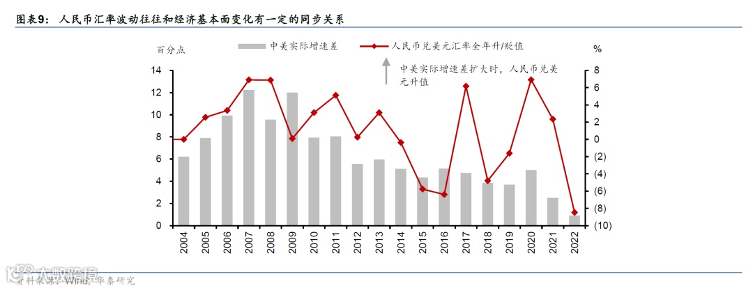 3.机理2——国内经济也呈现周期性,基本面趋势变化会触发逆周期调节,增长预期改善也将为人民币汇率提供支撑。人民币汇率波动往往和经济基本面变化有一定的同步关系(图表9),所以当人民币上浮或下浮进行一段时间、或进入加速阶段,往往经济基本面的周期变化也进入宏观调控区域。所以,时点上看,升值加速后可能有为周期降温政策,反之亦然。目前,再通胀动力走弱,稳增长窗口期再次来临。