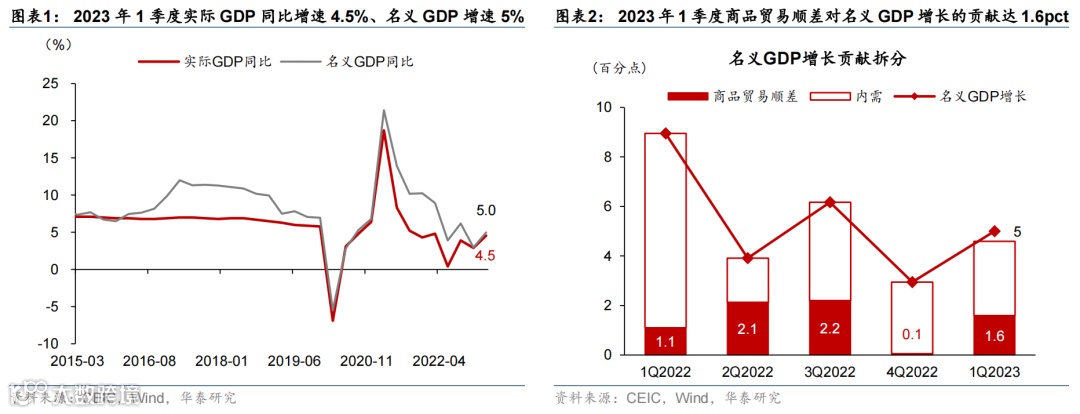 将生产端和需求端的GDP和分行业数据和高频数据对照,没有出现(类似去年1-2月间)明显的背离。例如,服务业实际增长在2023年1季度达到5.4%,对实际GDP增长贡献占69%(3.1个百分点),和实际“体感”及高频数据趋势基本一致。此外,服务业对名义GDP增长贡献达到4.1个百分点、占比8成有余、也并无太大疑点。此外,如我们在《3月出口大超预期意味着什么?》(2023/4/13)中所分析的,1季度名义货物贸易顺差超预期扩张44%,对1季度名义增长贡献达到1.6个百分点(图表2),隐含名义内需+服务贸易逆差对GDP贡献仅3.4个百分点,而社零一季度增长5.8%,消费对名义GDP增长贡献占比近半(约2.3个百分点)——由此看,1季度5%的名义增长也难言高估。