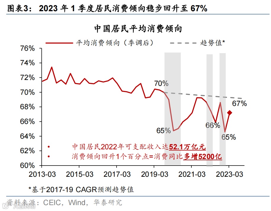 总体而言,1季度的增长超出了我们的预期。值得重申的是,虽然我们对全年GDP增长预测达到6.2%,我们原本对1季度实际GDP的增长预测不及4%。数学上,我们并未“打满”对1-2季度增长回升斜率的预期。反而,我们认为消费倾向在一季度会有一个“爬坡”的过程,不会很快回到疫情前水平。我们对增长较乐观的预期,很大程度基于去年基数低带来的抬升效应。所以,在今年1月我们6.2%的GDP预测发布后,我们也反复解释一点,即我们的预测不仅考虑到了“均值回归”的方向、也为疫情可能的疤痕效应留出了缓冲区间(参见《上调2023年增长预测至6.2%》,2023/1/29)。此外,彼时我们对地产需求回升斜率的预期也仅仅是从去年4季度的低点环比回升、符合常识判断,对2023全年销售仅预期个位数小幅增长。