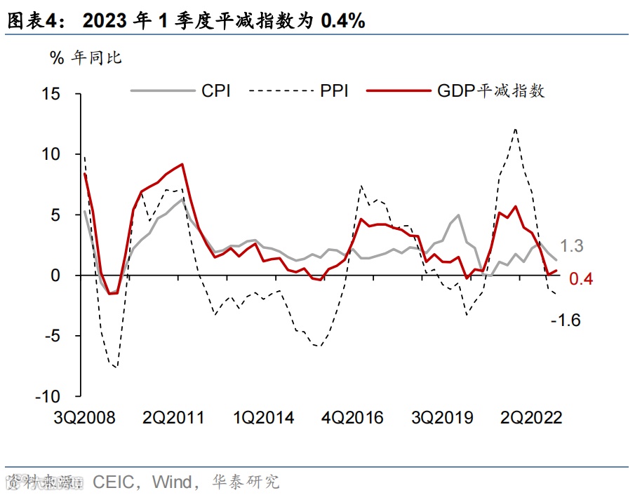 2023年1季度GDP平减指数从去年4季度的0.0%回升至0.4%, 比CPI和PPI加权平均指数回升更为明显,可能隐含土地和房产价格温和再通胀(图表4)。这一数据支持我们核心通胀回升的观点(参见《防疫优化的影响是再通胀而非通缩》,2023/4/13)。往前看,核心通胀在1季度可能已过低点,此后有望企稳回升。基数明显走低也有助于提振表观通胀的表现。