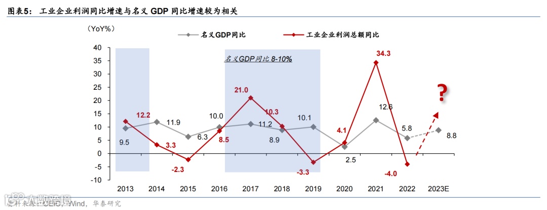 1-2月工业企业利润数据引起了市场的关注,我们当时的分析是,效益因素之外,1-2月往往受一些一次性因素的影响较大,不宜过度解读(参见《开年工业企业盈利下降的部分解释》,2023/3/27)。1季度名义GDP数据公布后,我们对企业盈利的走势更有信心了一些。因为,名义GDP和企业盈利的增长是明确正相关的(图表5)——不排除今年企业盈利增长的低点已经过去。