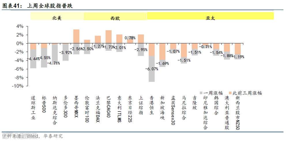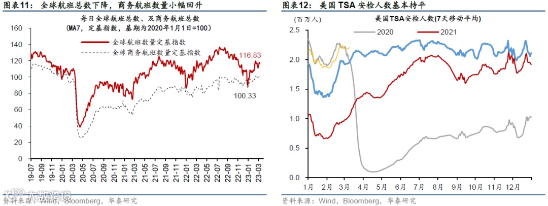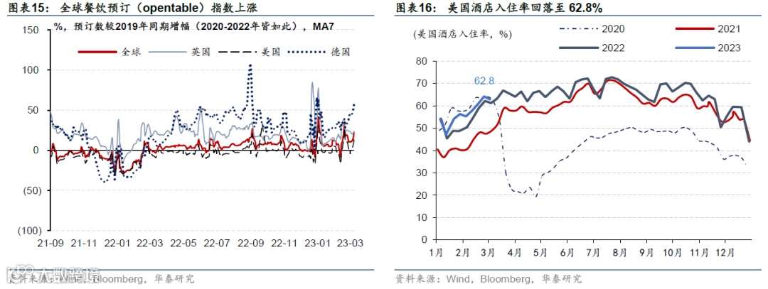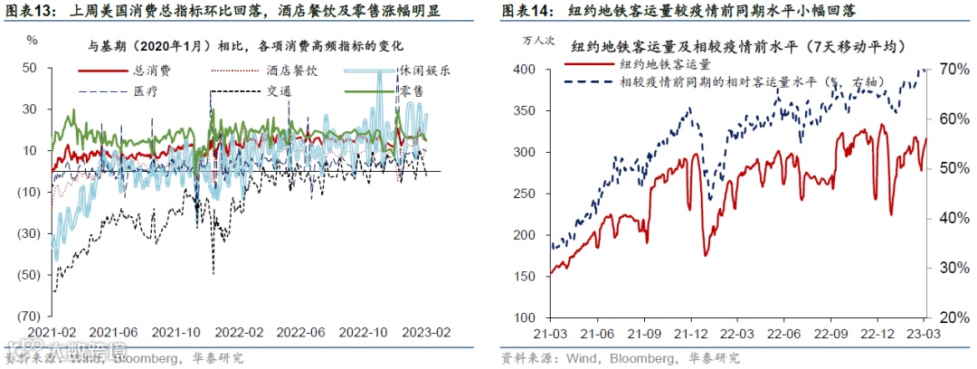 高频数据显示,美国出行活动基本持平,消费方面酒店餐饮及零售升温。上周美国TSA安检人数基本持平,纽约地铁客运量环比虽有上升,但较疫情前同期的相对客运量水平小幅回落。总消费环比回落,但酒店餐饮(+20.6%)和零售活动(+26.2%)大幅上涨,美国餐饮预定指数也较上周有明显抬升。