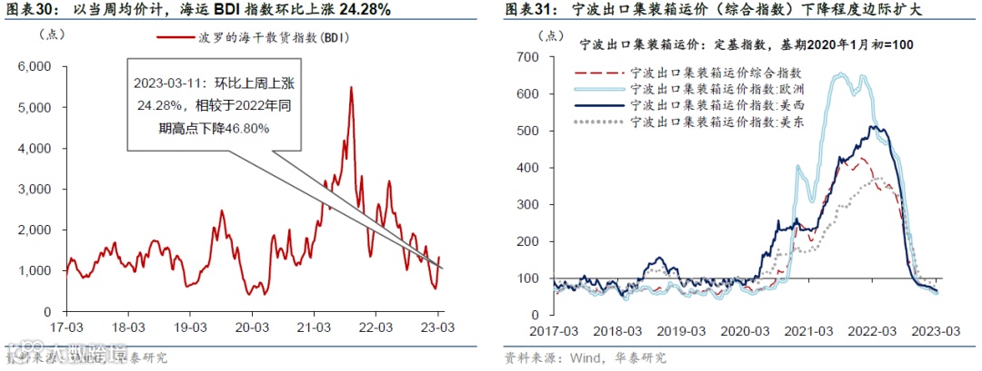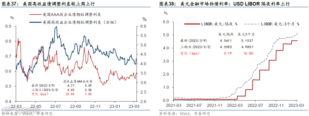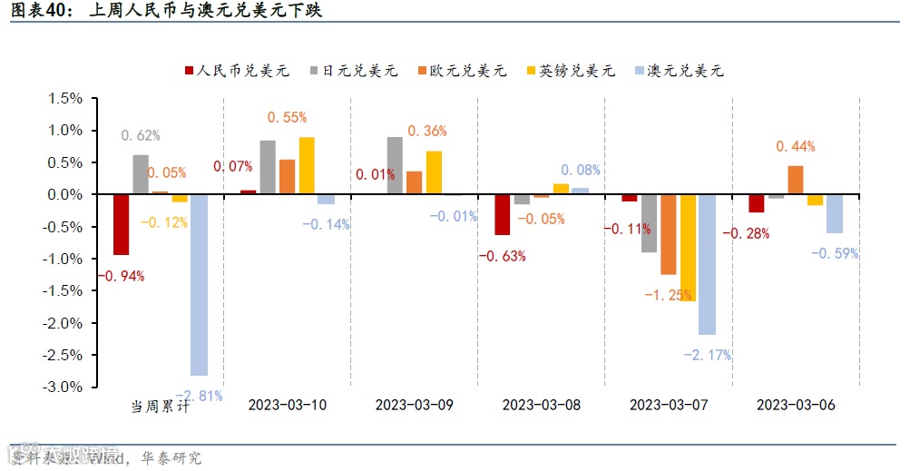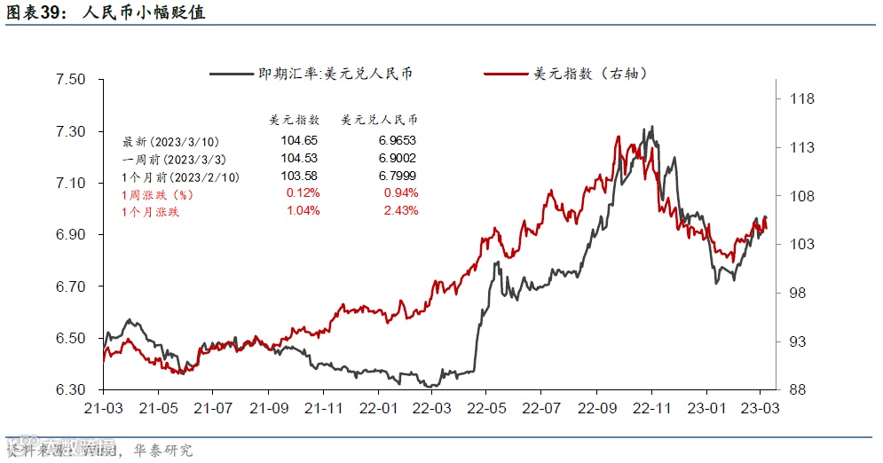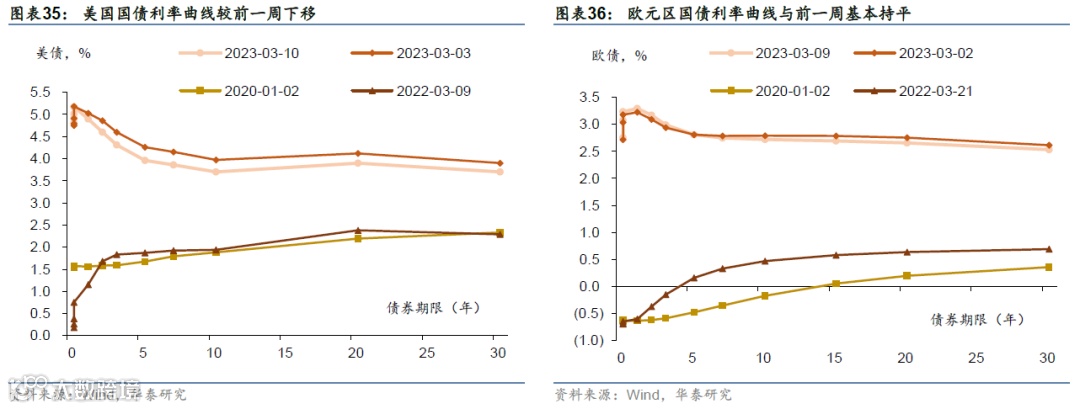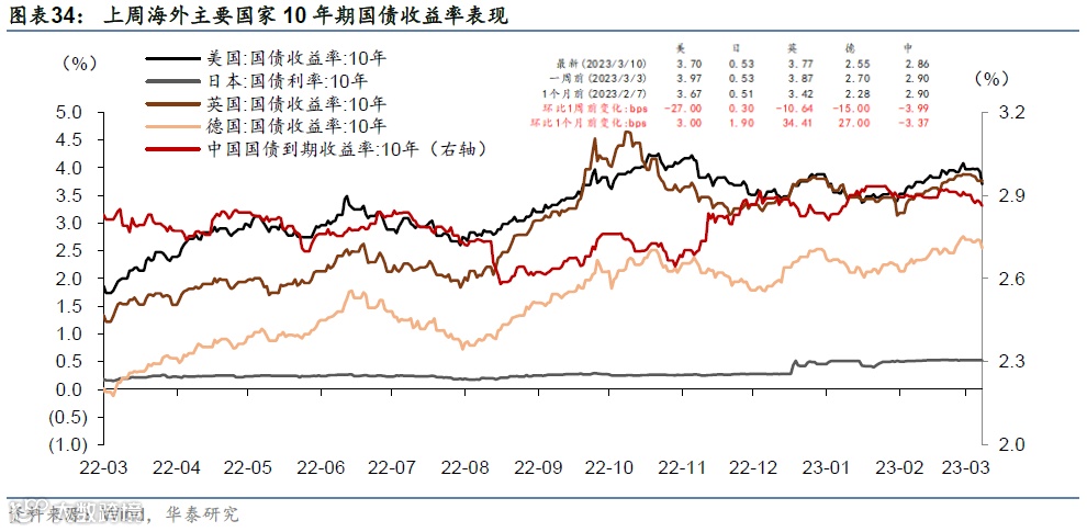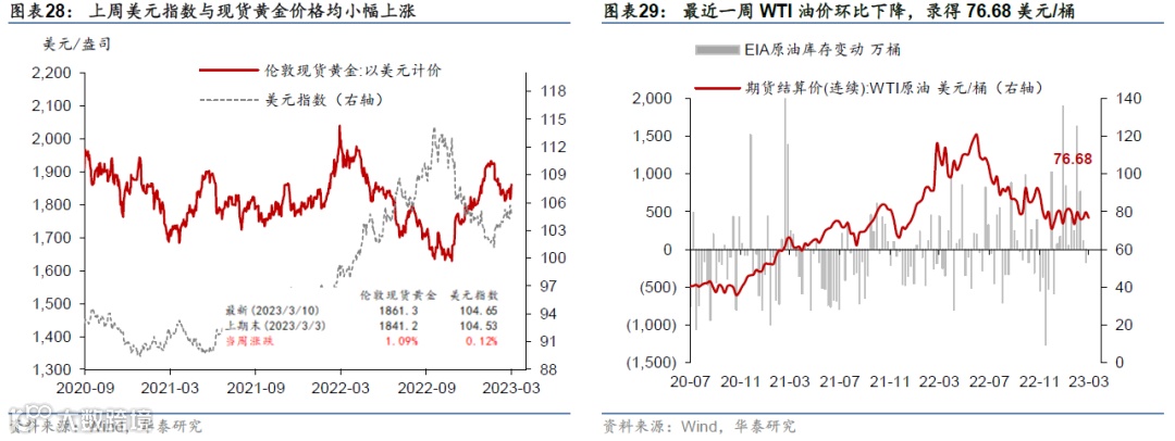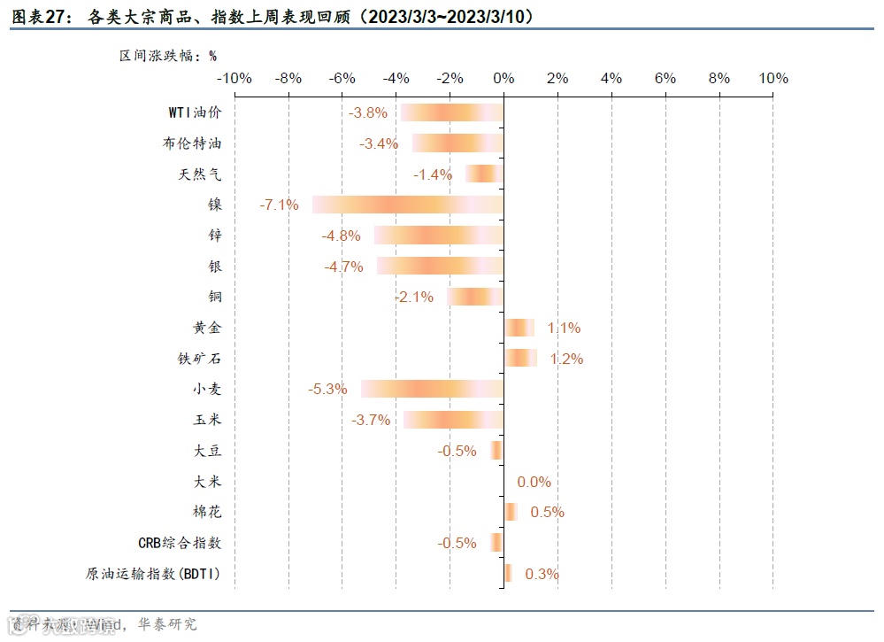 加息预期回落,美债收益率下行,大宗商品跌多涨少,美股三大指数齐跌。尽管鲍威尔于听证会释放鹰派信号,表示准备加快加息、利率终值可能高于预期,但受硅谷银行事件继续发酵以及非农数据的影响,市场加息预期有所回落,美联储或需要更好地在通胀和金融稳定之间进行权衡取舍。市场预期美联储3月FOMC加息50bp概率从高点70%左右回落至30%以下,年内加息终点从5.69%降至5.27%。美国国债利率曲线较前一周下移,10年期国债收益率上周下行27bp至3.70%,现货黄金涨1.09%至1861.3美元/盎司,纽约股市三大股指10日显著下跌。大宗商品价格方面,WTI与布伦特油价环比分别下行3.8%和3.4%;天然气上周下降1.4%;镍(-7.1%)、锌(-4.8%)、银(-4.7%)以及铜(-2.1%)等工业金属加工环比亦走弱。